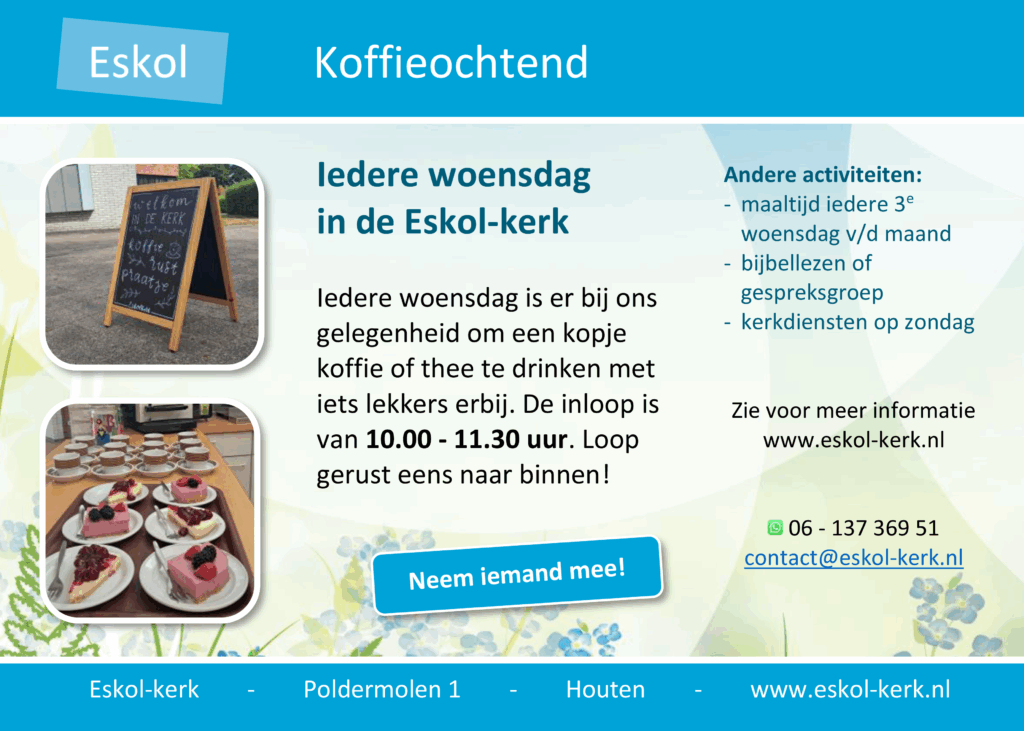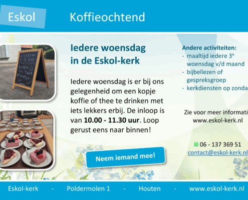 Iedere woensdag is er bij ons in de kerk gelegenheid om een kopje koffie of thee met iets lekkers te komen drinken. Regelmatig worden er ochtenden met een thema georganiseerd, zoals een presentatie of iets met muziek.